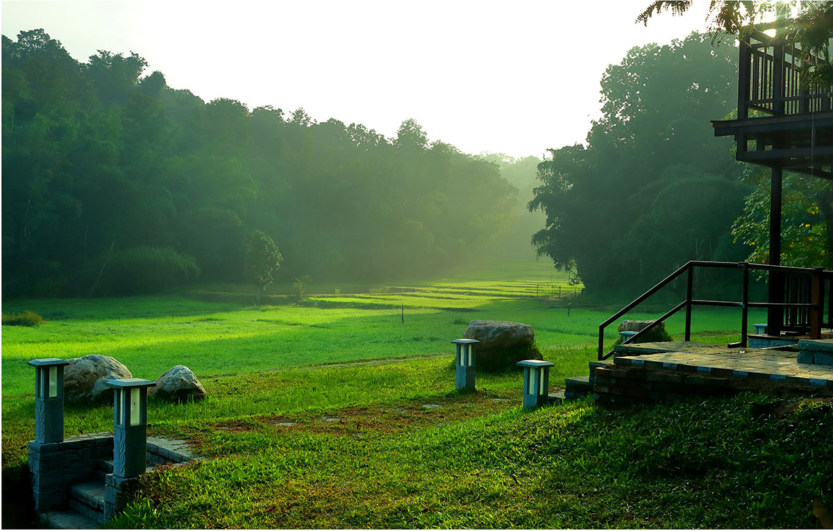 A poignant silence, punctuated by a symphony of bird calls, trumpeting elephants, the rustle of leaves, a gentle breeze prompts green gold yellow paddy stalks to dance in unison. Clouds laden with promise of rain, of a bounteous harvest, float down into the valley.