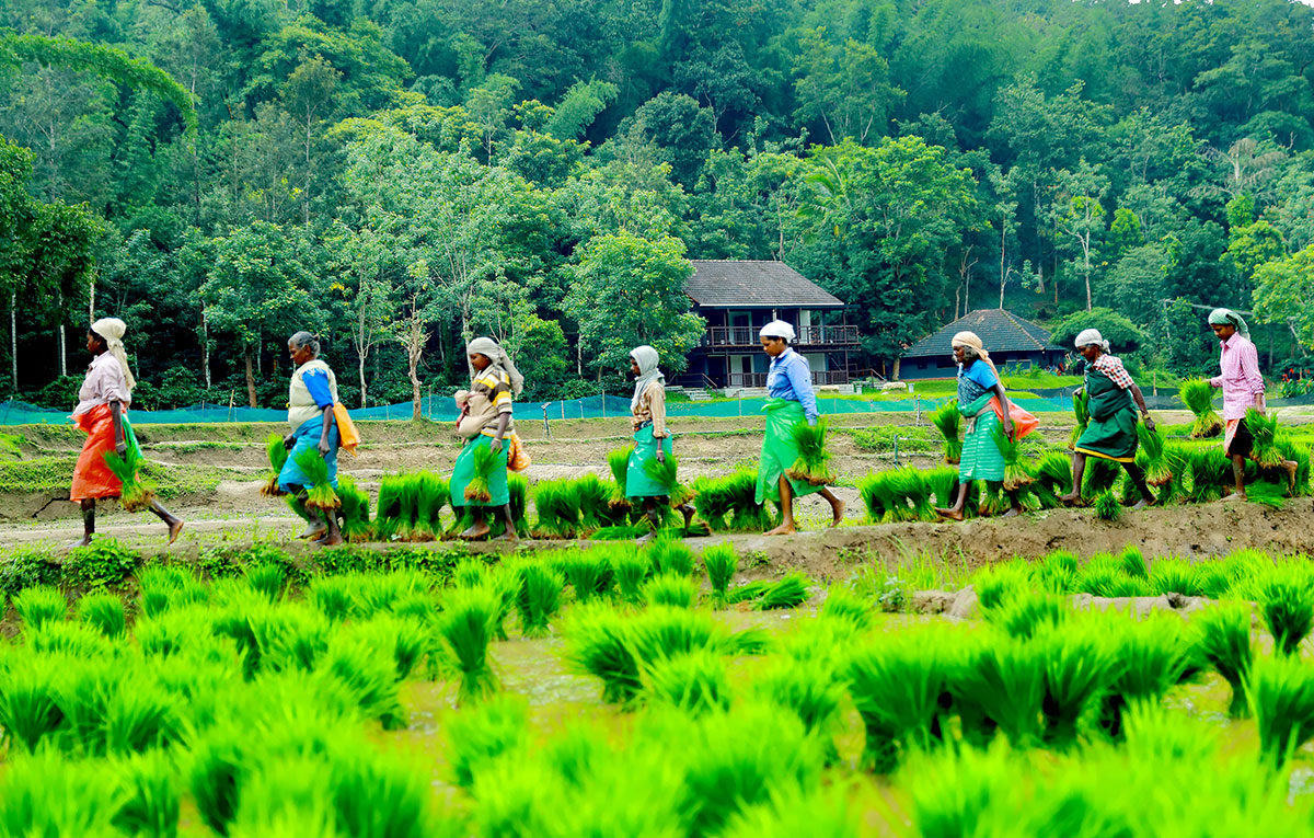 A village road turns off from the highway past a town named Sulthan's Battery, winds languidly through large stretches of green gold paddy on either end, passing hamlets fringed by areca nut and coconut trees and a line of hills to the west. Entering a valley surrounded by a dense forest, guests arrive at Vayal Veedu.